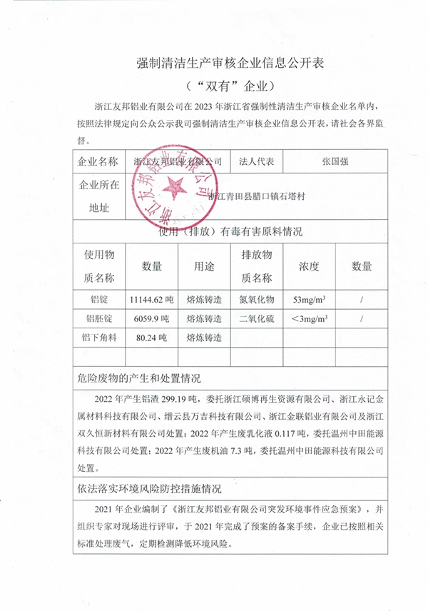 浙江友邦鋁業(yè)有限公司在2023年浙江省強制性清潔生產審核企業(yè)名單內,按照法律規(guī)定向公眾公示我司強制清潔生產生產審核企業(yè)信息公開表,請社會各界監(jiān)督。